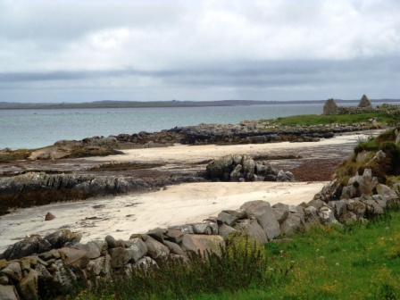 On Mweenish Island, just ten minutes’ drive in the other direction, a random turning off the boreen brings us down a barely-paved track to a gem of a little beach overlooking Mweenish Bay. Facing east on a breezy day, there is hardly a breath of wind as the family diverges to poke around rock pools, scramble on rocks or simply drink in the view. The sun comes out and we sit contentedly on boulders of Connemara stone, faces upturned to the summer warmth. Across the water on Finish Island, the ruins of an old village rise up against the sky. Seven or eight houses, abandoned presumably during or after the famine year.