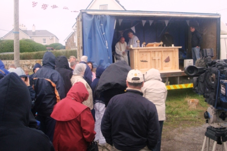 An hour later, we stand in a throng of three or four hundred people facing the newly-hewn altar now atop a Joyces of Recess curtain-sided truck at the base of the céibh. A heavy shower gives way to sunshine as the Cill Chiaráin priest gets Mass underway. It is conducted in Irish, of course, with a few welcoming words in French and English at the beginning for the small number of tourists from the local hotel. Before Mass is ended, two local babies are christened on the quayside as part of the féile celebrations. We stand together, taking in the scene, and are grateful to be given the opportunity to be part of this old parish tradition.