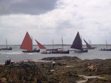 When Mass is over we mill around the céibh and the rocks, as a flotilla of Galway hookers magically appear in the bay. There will be sea racing and live traditional music all day. We sit on the edge of the céibh, gazing seawards as the traditional brown-red sails unfurl above the pitch-black craft. And they’re off! Round the holy island and back: we watch their ballet all afternoon as currach races happen closer to shore.