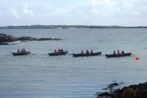 Meanwhile four gleaming currachs, newly painted black, their gunwales and oars picked out in vibrant red, green, yellow and blow, get ready for the off. The sea is choppy and the tide is coming in as they head out to the island. We are cosy under three or four layers of warm clothes whilst these modern-day gladiators battle against the waves of the Atlantic bare-chested except for their flotation devices. They row so far out that we can no longer tell them apart. As they make the return journey, a roar goes up from the crowd as we can see who is in the lead. It is not the young bucks in the yellow currach who win, but four much older – much more experienced – men in the blue currach who coast over the line first. All four crews are cheered in equally as they return, after continuing a centuries-old tradition which has not lost its excitement or popularity in the twenty-first century.