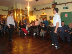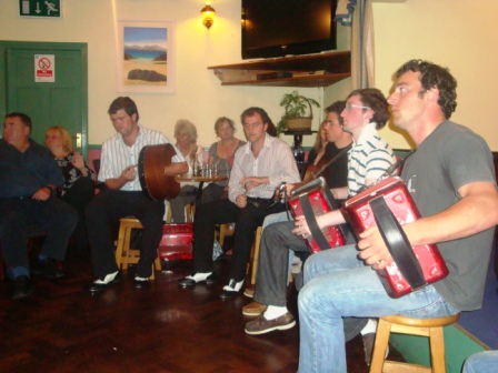 Later, in the local hotel we dine on seafood chowder and Connemara lamb as the evening’s entertainment begins. Danny O’Flaherty, a local musician now based in New Orleans, leads a night of traditional music and song to the delight of the American tourists, the substantial local crowd and the Doyle clan. I recognise the melodian player as one of the young musicians from the céibh this morning. We start with a few ballads in both Irish and English from Danny, then the dancing begins. A young fellow, not more than nine or ten, dressed nicely in a yellow pullover and green Nike trainers, takes to the floor as an energetic reel commences. He dances in the more casual local style, arms outstretched at times to balance himself. A few minutes in he is replaced by an older girl, perhaps in her twenties, with hornpipe shoes, sweater and leggings. None of your Riverdance costumes here: she is dressed for a night out in the pub. Her long hair flies as her shoes beat out a rhythm on the wooden floor. As she retreats back to her seat, a bloke who looked like he was coming back from the gents wanders onto the floor: obviously related to the young dancers, his black and white tap shoes are at odds with his ordinary shirt-and-trousers attire as his feet fly. His brother joins him after a time, a heavier-built chap in matching shoes; the brothers duel with their feet and lead the family members in a final flourish as the crowd jump to their feet. Brilliant.