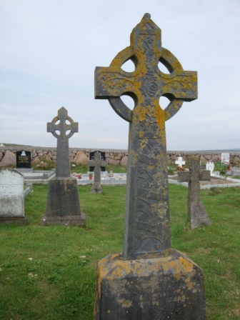 The cemetery standing alongside the beach – all the dead of Connemara enjoy stunning views – has graves going back to before famine times. Plenty of people had eighty years or more before they turned up their toes: must be the sea air. A poignant headstone tucked at the back of the old chapel ruins commemorates Nora and Mathias McDonagh and their three young sons aged eight, five and four, all of whom died in June 1909. The headstone was erected by the children of their only remaining child, a daughter, Mary McDonagh McGagh, who died in Boston in 1990 aged ninety-nine. Another grave at the very edge of the cemetery had the headstones all facing the wall: very odd until you climb around to read the inscriptions and find two of the three buried there had died in America. The headstones are facing west across the Atlantic.