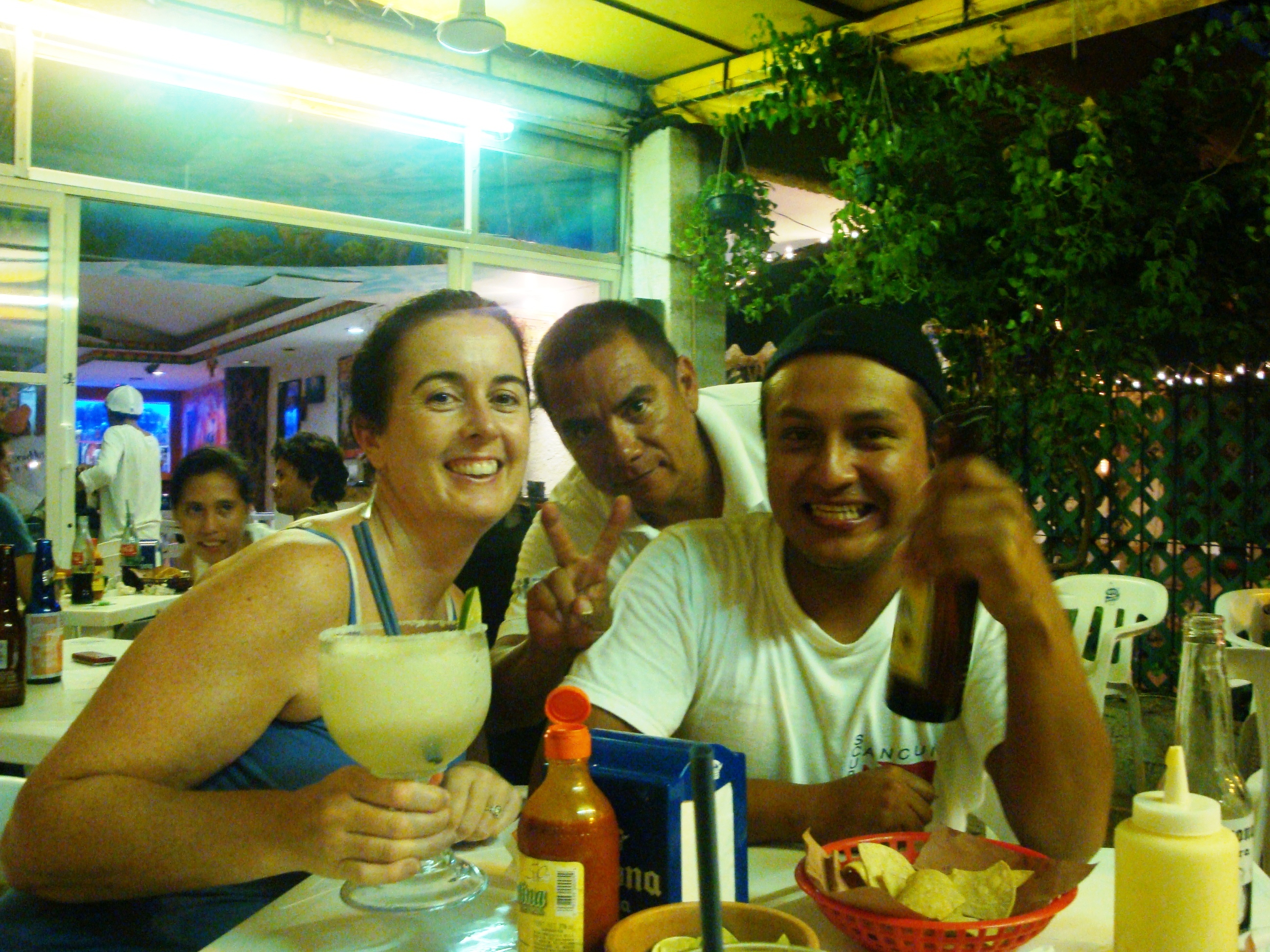 Later, wandering down the street near the hotel on the way back from the internet place, I heard my (Mexican) name being hollered behind us: “Margarita! MARGARITA!!”. It was Victor who had just dropped off my dive DVD. We joined himself and Quetzal in a little local place called Pescaditos for a bite to eat. I happily received my first – enormous – frozen margarita of the Mexico trip, and then a second. How lovely to have a cocktail named after me. Quetzal recommended the pescadillas as a house speciality and he was right. Sort of like a fish empanada or a quesadilla using fish instead of cheese, it was served with an excellent habanero sauce that we couldn’t get enough of. We put the world to rights with Victor and Quetzal, before heading back to the hotel to pack our bags ready for our trip to Tulum early the next morning. An excellent end to an excellent day.