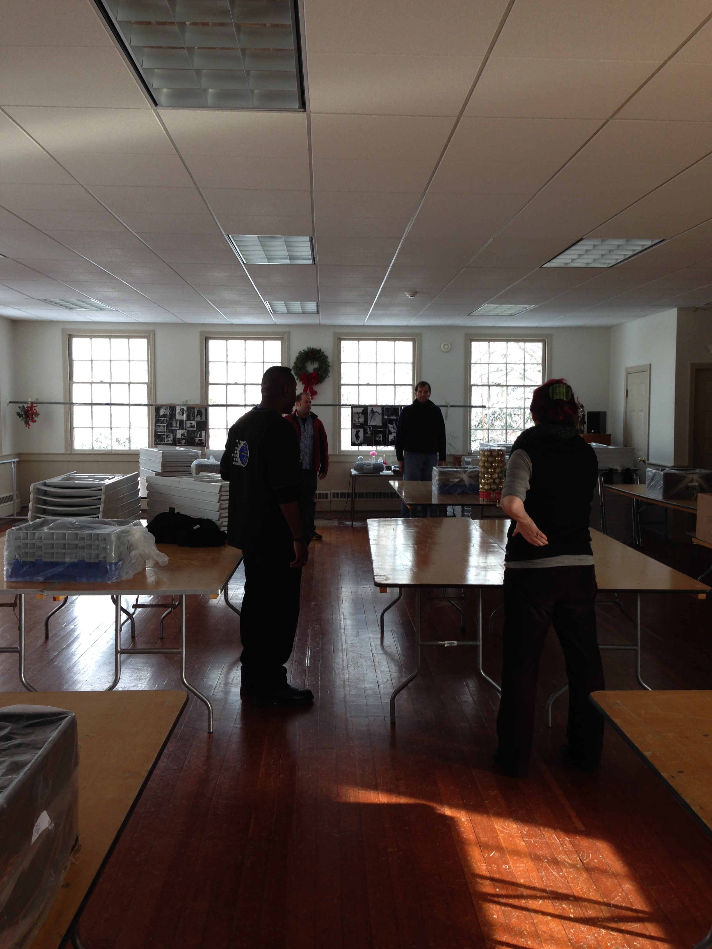 With cold weather taking hold a few weeks earlier than normal, the Connecticut River towns are knee-deep in perfect snow as we make our way to Centerbrook to decorate the wedding hall. Helen and Mike are getting married on Friday 13 December in a beautiful old meetinghouse, originally built in 1722 and recently renovated by two private benefactors.