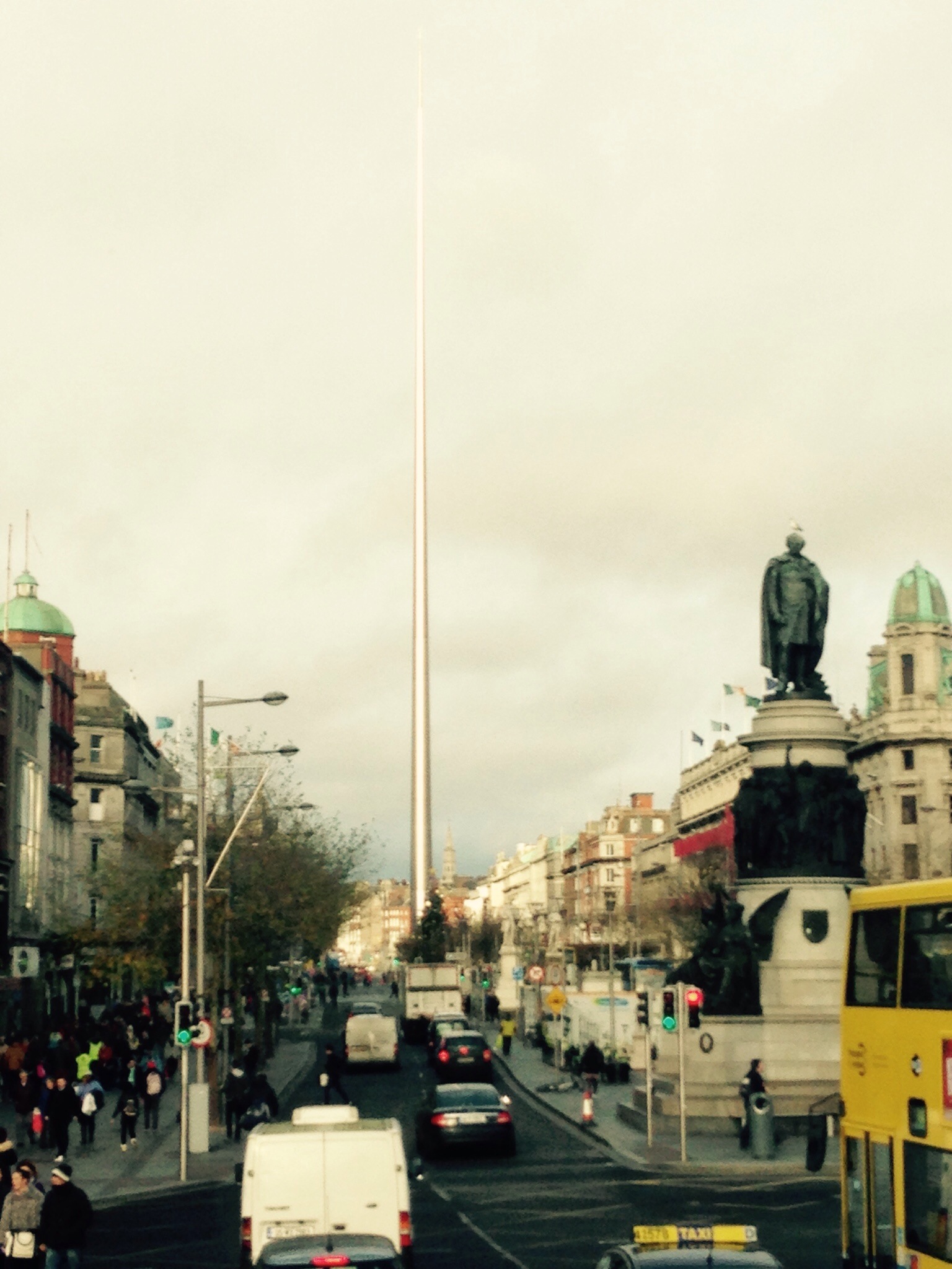 Round by Westmoreland Street the crowds continue. The Spire rises up into the cold grey sky like a giant silver needle, dwarfing everything on O’Connell Street. Hard to imagine Dublin now without this marker of the new millennium.