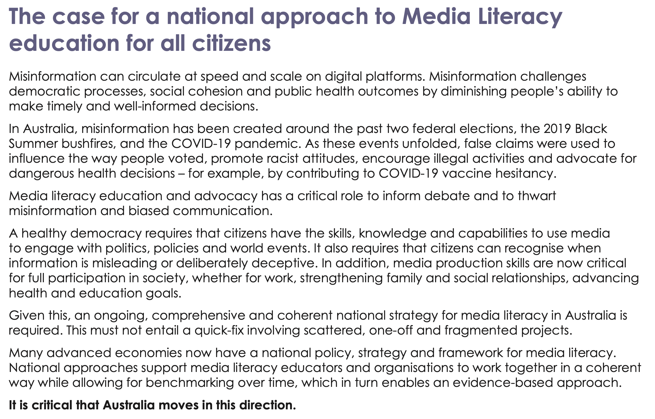 Australia does not (yet) have a similar National Media Literacy Strategy, but we do have the Australian Media Literacy Alliance, a joint venture between a number of public and scholarly institutions, whose  primary goal is to develop and promote a government-endorsed national media literacy strategy for Australia.